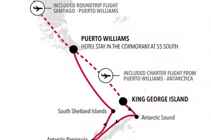 包含在乔治王岛登船或离船的邮轮行程,将提供圣地亚哥与威廉姆斯港之间,以及威廉姆斯港与乔治王岛之间的包机航班。